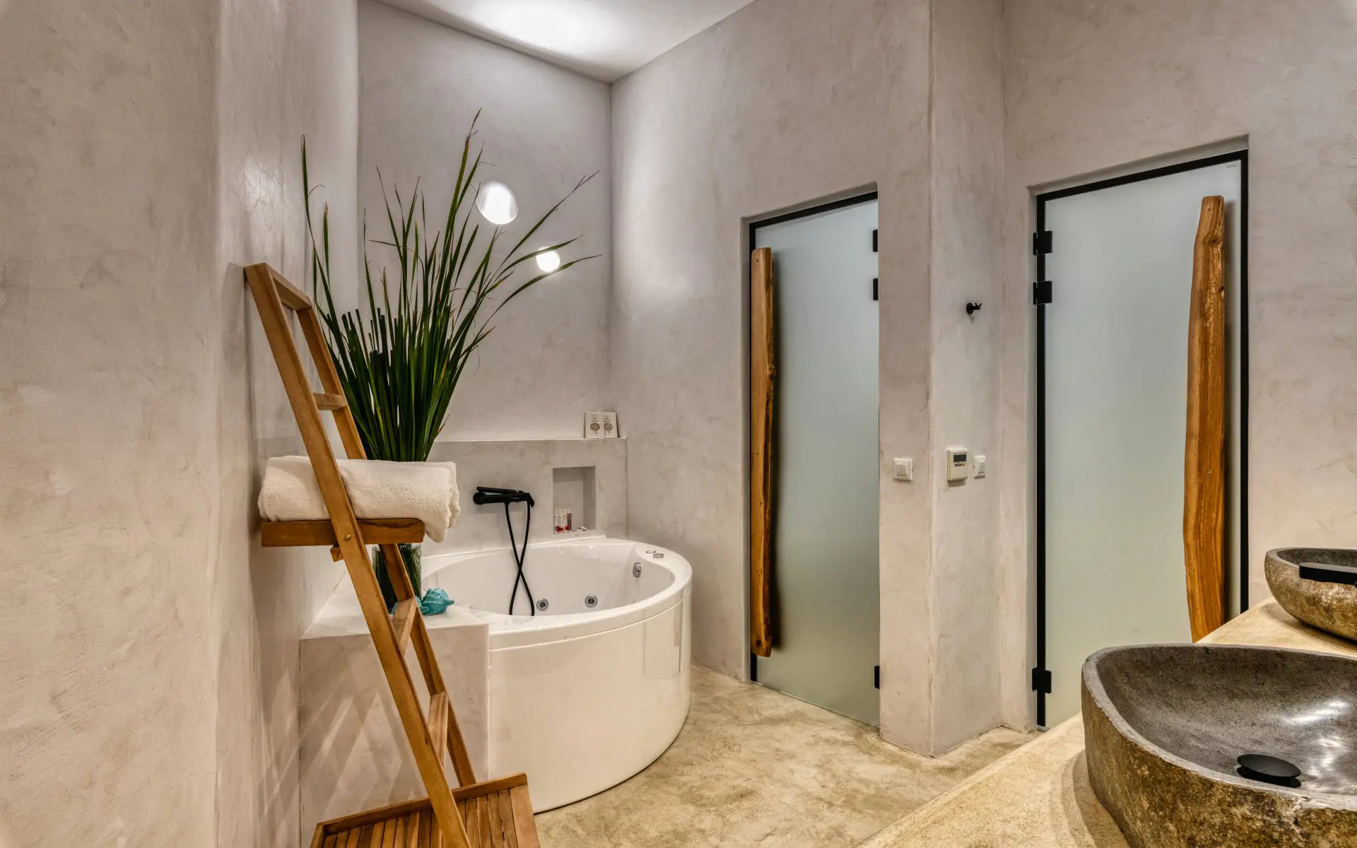 Η παραδοσιακή πέτρινη αρχιτεκτονική συναντά τη μινιμαλιστική φιλοσοφία «όσο λιγότερα, τόσο καλύτερα», ενώ οι φυσικές υφές και τα γήινα χρώματα ενσωματώνονται αρμονικά στον σχεδιασμό.