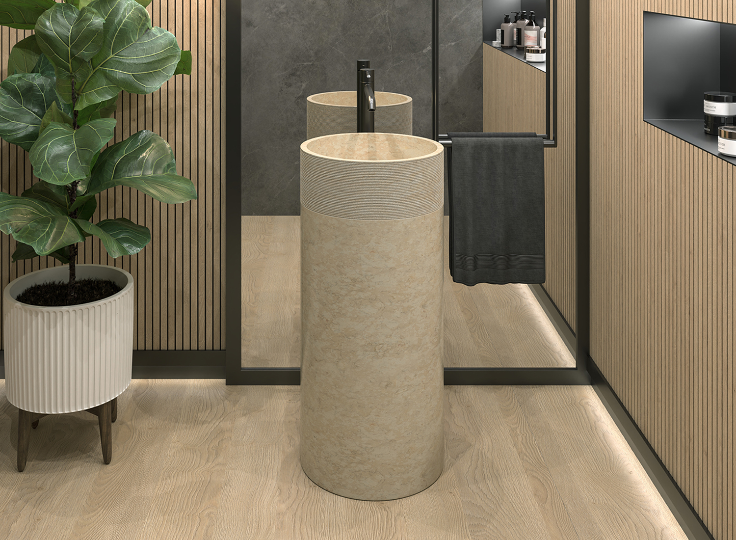 Ο νιπτήρας «Detroit» της Art & Bath αποτελεί μία εντυπωσιακή επιλογή για μπάνια όπου η αισθητική παίζει εξίσου σημαντικό ρόλο με τη λειτουργικότητα. Σχεδιασμένος για εγκατάσταση «επιδαπέδια» (de pie), ο «Detroit» αποπνέει φυσικότητα και μινιμαλιστικό χαρακτήρα: κατασκευάζεται από πέτρα (material: piedra) σε φυσικό χρώμα μπεζ/μαρμάρινο τόνο, ενώ η κυλινδρική του μορφή και οι καθαρές γραμμές του ενισχύουν την αίσθηση ενός χαρακτηριστικού design στοιχείου μέσα στο χώρο του μπάνιου.