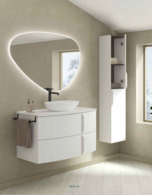Το έπιπλο WAVE ξεχωρίζει για τις απαλές, καμπυλωτές του γραμμές που συνδυάζουν αρμονικά την αισθητική με τη λειτουργικότητα. Ο σχεδιασμός του αποπνέει κομψότητα και μοντέρνα φιλοσοφία, ιδανικός για τη δημιουργία μπάνιων με χαρακτήρα και προσωπικότητα.