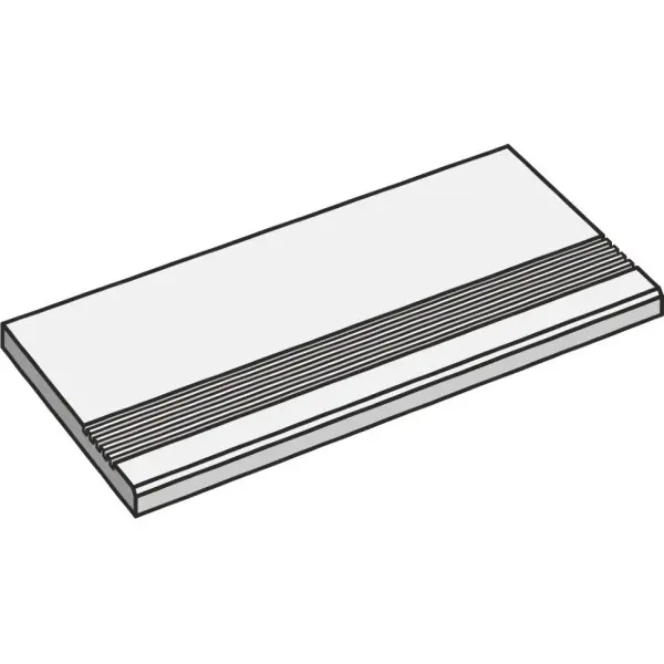 Πρόκειται για ειδικό τεμάχιο σκαλοπατιού από πορσελανάτο gres με αντιολισθητικες γραμμές μπροστά, σχεδιασμένο για τελειώματα σκαλοπατιών.