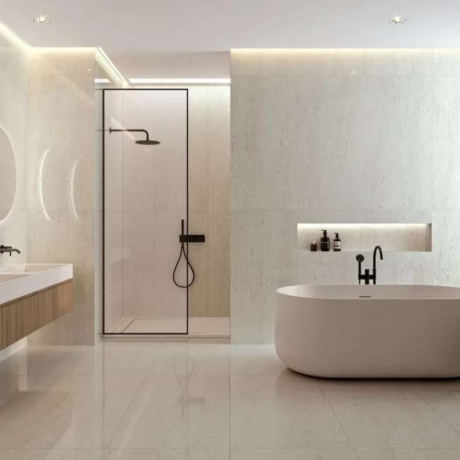 Η επιλογή των κεραμικών πλακιδίων έγινε με γνώμονα την πολυτέλεια, την υγιεινή και την ανθεκτικότητα, ώστε να ανταποκρίνονται στις αυστηρές προδιαγραφές ενός σύγχρονου ιατρικού περιβάλλοντος. Οι λείες, γυαλιστερές επιφάνειες αντανακλούν το φως, δημιουργώντας φωτεινούς και ευχάριστους χώρους, ενώ οι ουδέτερες αποχρώσεις ενισχύουν την αίσθηση ηρεμίας και φροντίδας για τον επισκέπτη.